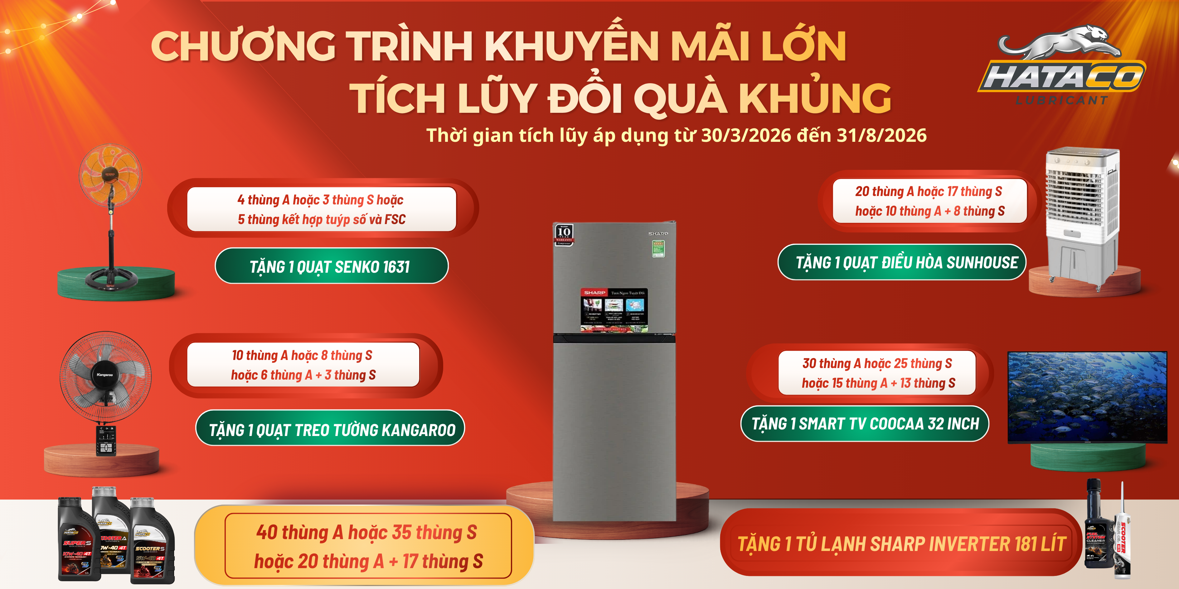 Để tiếp sức cho mùa kinh doanh cao điểm, HATACO chính thức tung chương trình khuyến mãi “Tích Lũy Thùng – Trúng Quà Khủng” dành riêng cho mặt hàng dầu nhớt. Đây là cơ hội vàng để Quý khách vừa tối ưu chi phí, vừa nhận về những phần quà giá trị cho cửa hàng và gia đình!