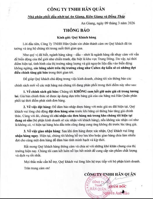 ​Kính gửi Quý khách hàng, ​Công ty TNHH HÂN QUÂN xin thông báo: Do ảnh hưởng từ sự tăng giá nguyên vật liệu và năng lượng toàn cầu, giá các sản phẩm dầu nhớt Caltex sẽ được điều chỉnh kể từ ngày 01/04/2026 (theo chính sách của Chevron Việt Nam). Thời gian áp dụng: Từ[...]